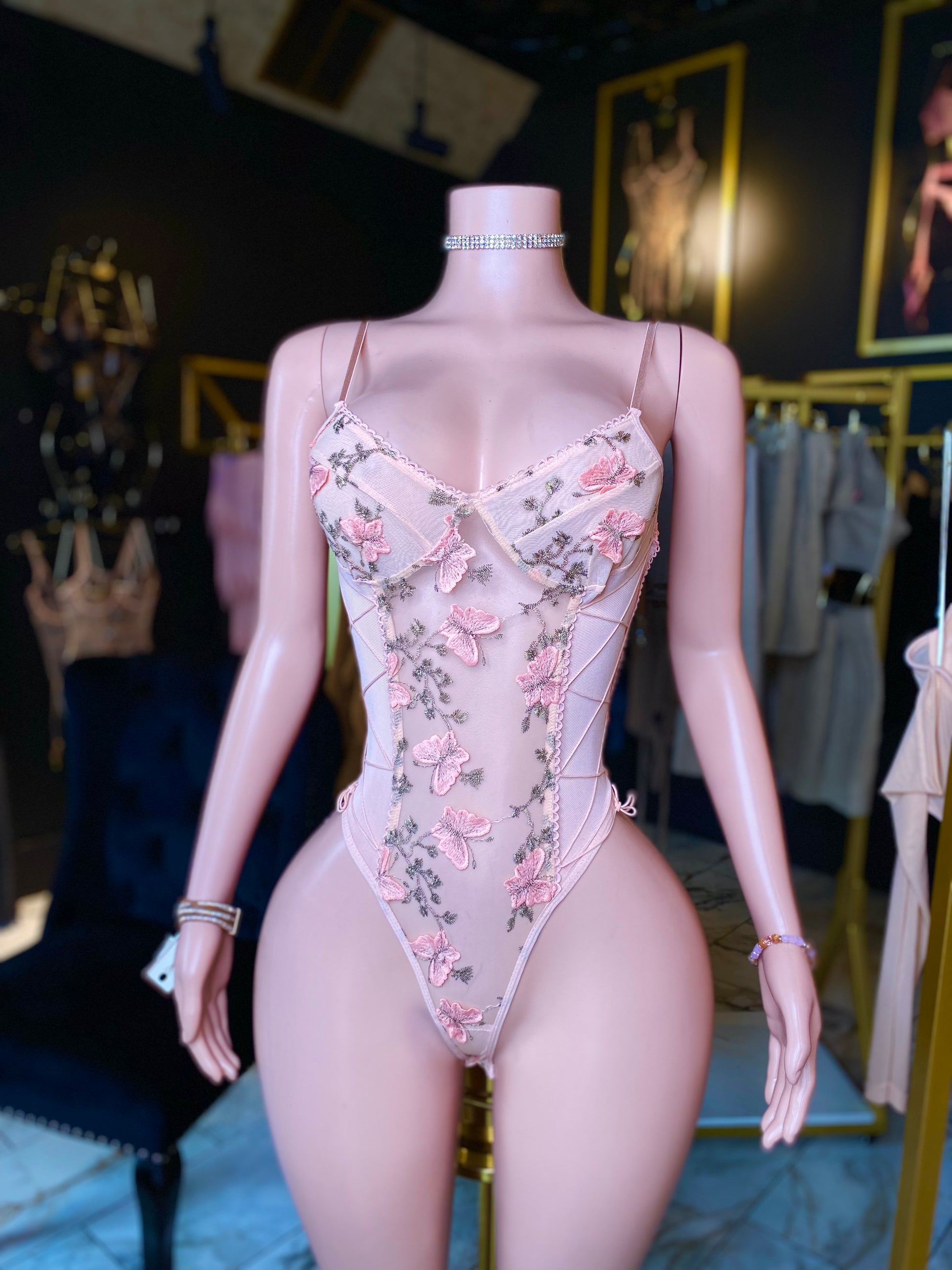 Lace up side teddy with embroidered butterflies on the cups and sheer waist panel.